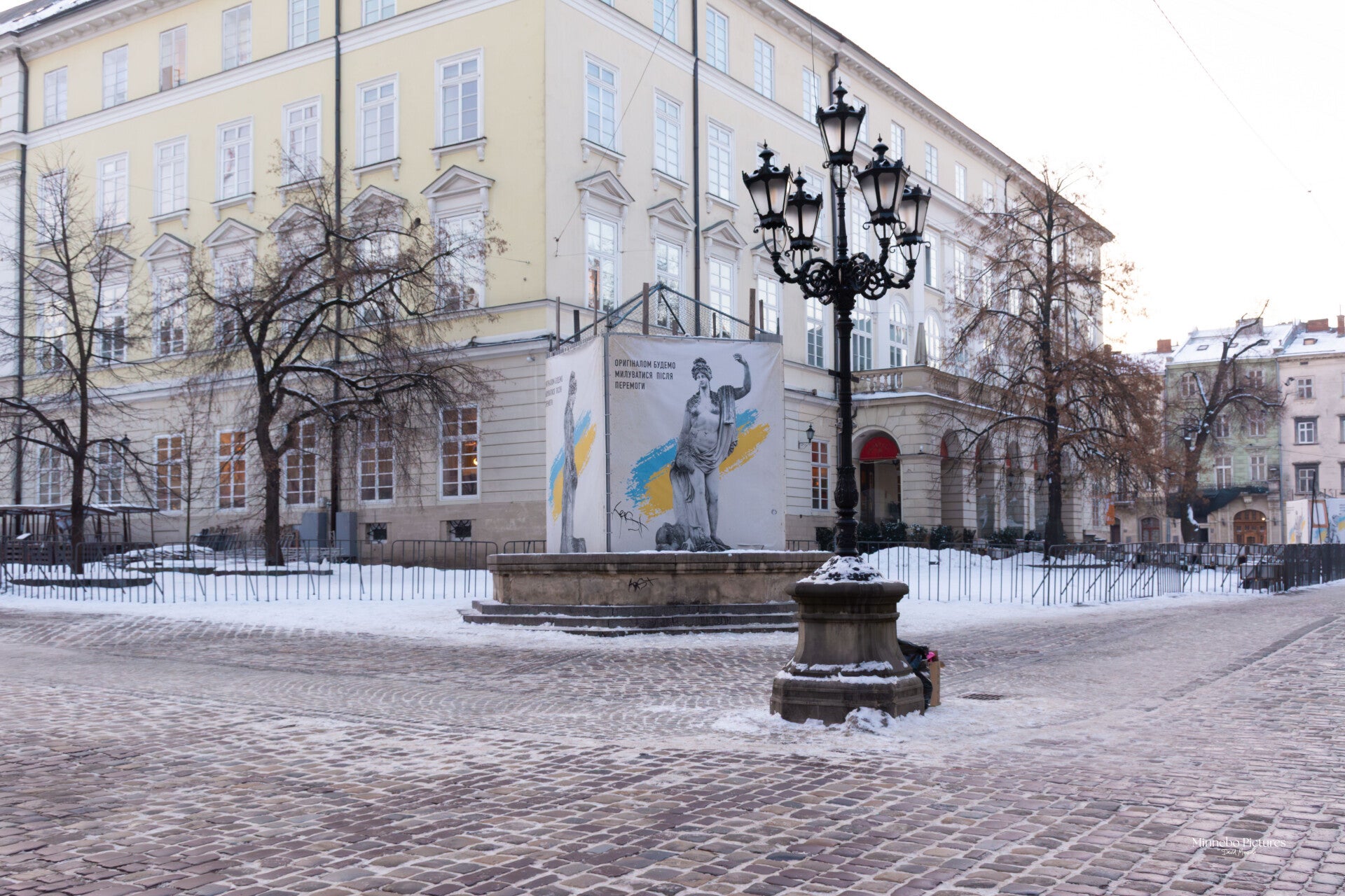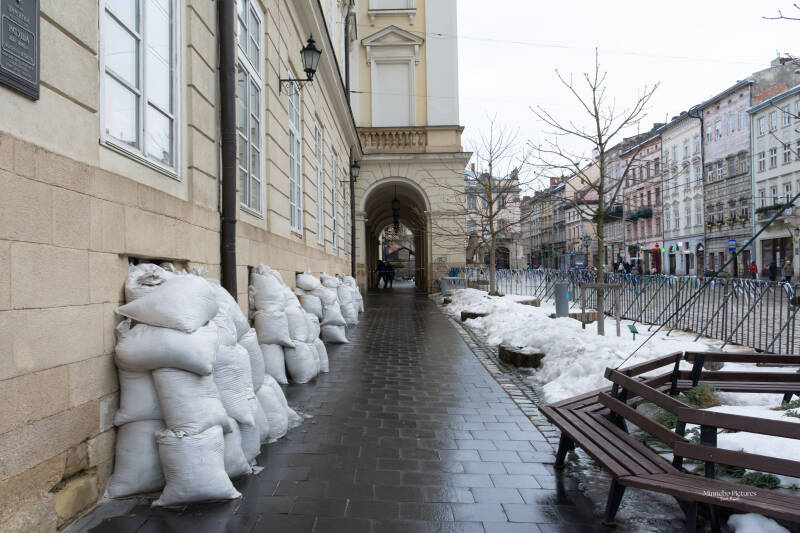 Aan het stadhuis liggen zandzakken opgestapeld om het historische gebouw te beschermen tegen mogelijke schade door de oorlog. Het is een eenvoudige, zichtbare maatregel die toont hoe Lviv waakt over zijn erfgoed