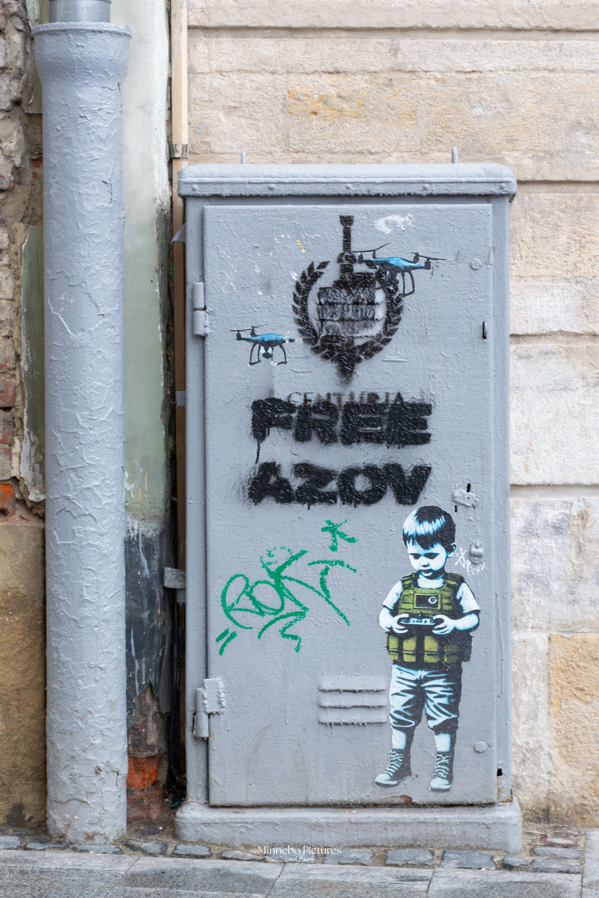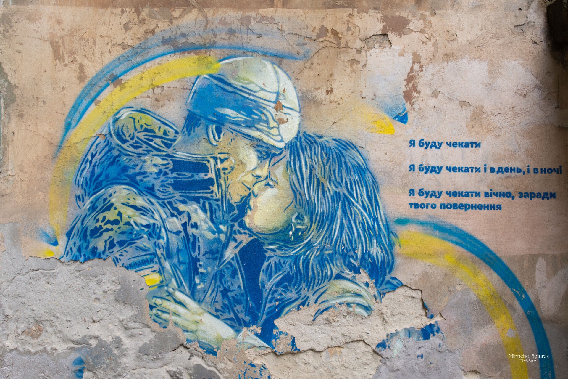 Deze foto toont een intiem moment dat je in Lviv overal kunt tegenkomen: een muurschildering van een soldaat en een vrouw die elkaar vasthouden alsof de tijd even stopt. De verf is verweerd, de muur gebarsten — maar juist daardoor voelt het beeld eerlijk en rauw. Het is geen romantisering, maar een echo van de realiteit waarin duizenden gezinnen leven.