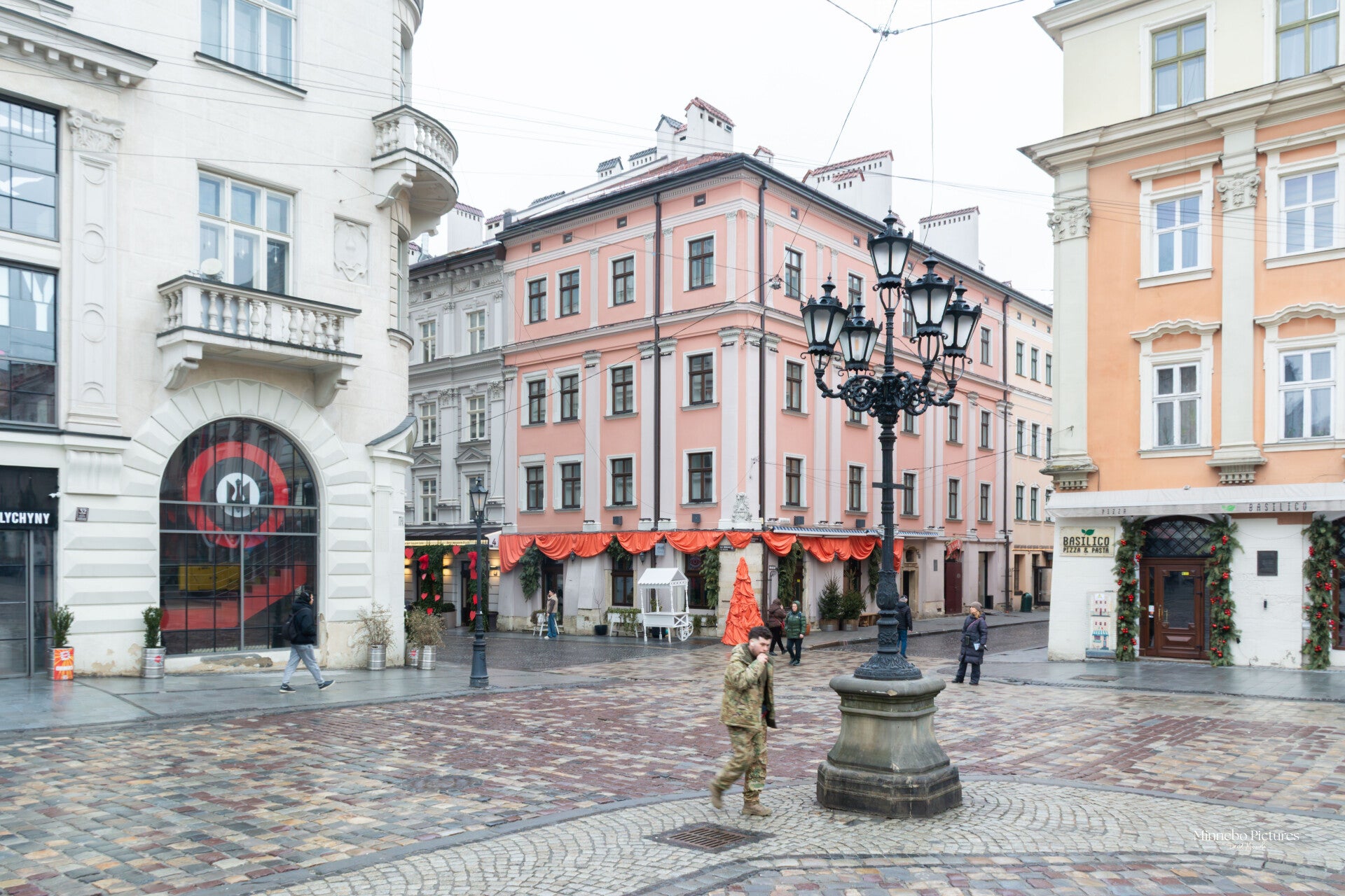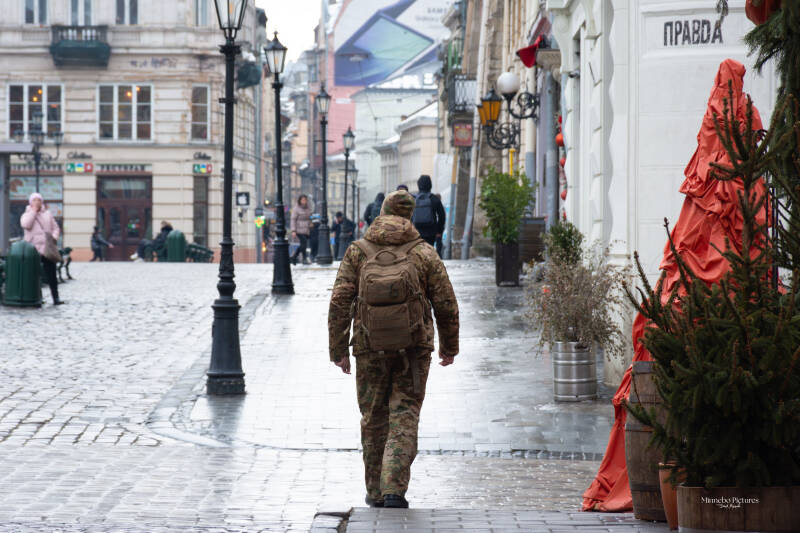 Op deze foto zie je een soldaat die door een natte, winterse straat in Lviv loopt. Geen heroïek, geen pose — gewoon iemand die onderweg is, met een rugzak die zwaarder lijkt dan alleen zijn uitrusting. Rondom hem gaat het leven door: mensen wandelen, cafés openen, een kerstboom staat half ingepakt tegen de kou.