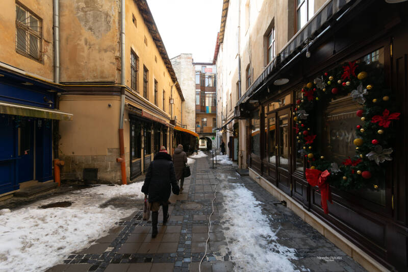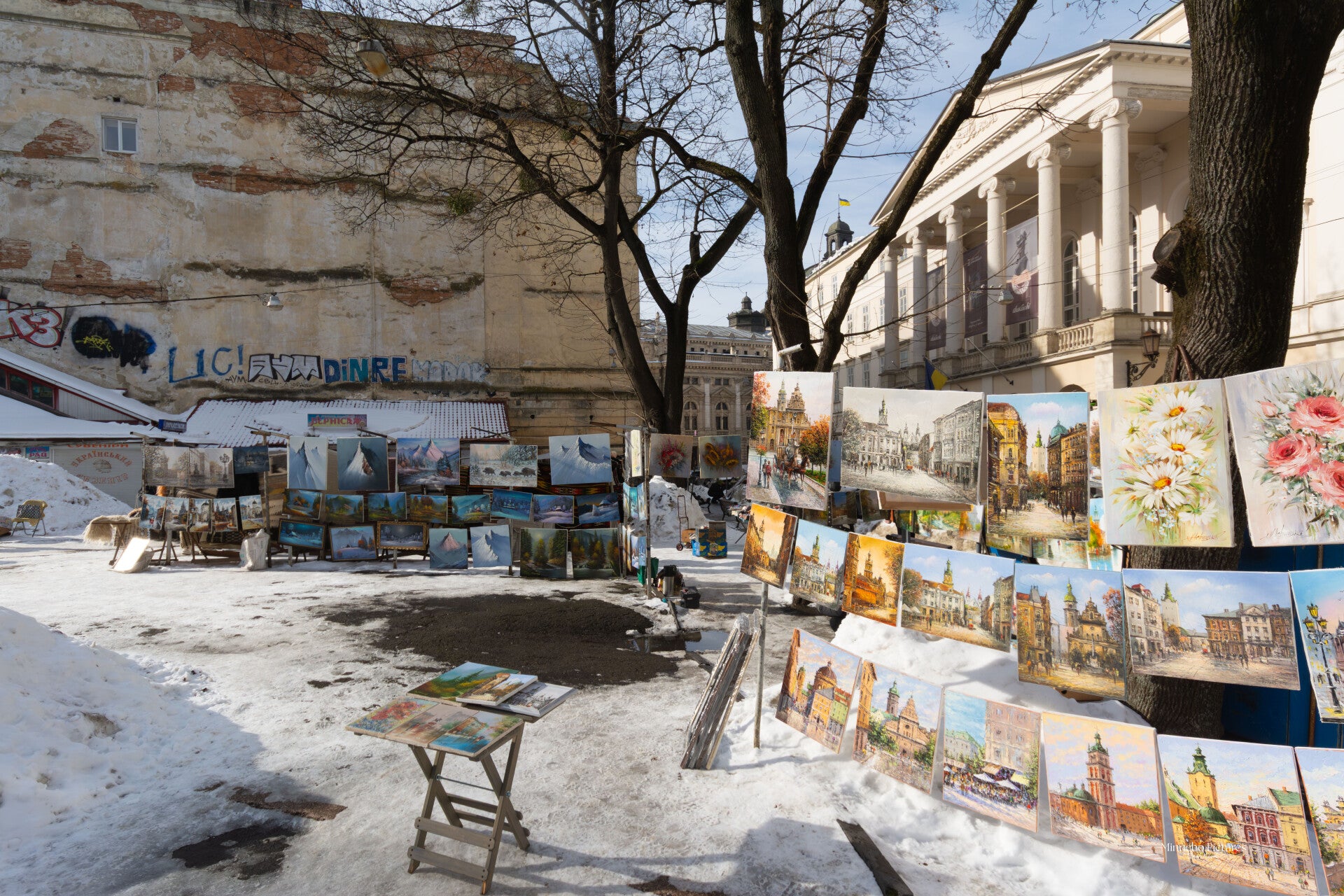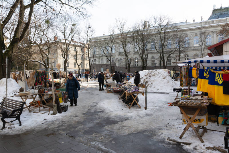 In de winter duiken in Lviv kleine marktjes op waar kleur en warmte het straatbeeld overnemen. Tussen de sneeuw vind je kraampjes met handwerk, schilderijen, lokale producten en souvenirs met Oekraïense symbolen. Mensen wandelen er rustig langs, kijken, praten, kopen iets kleins.