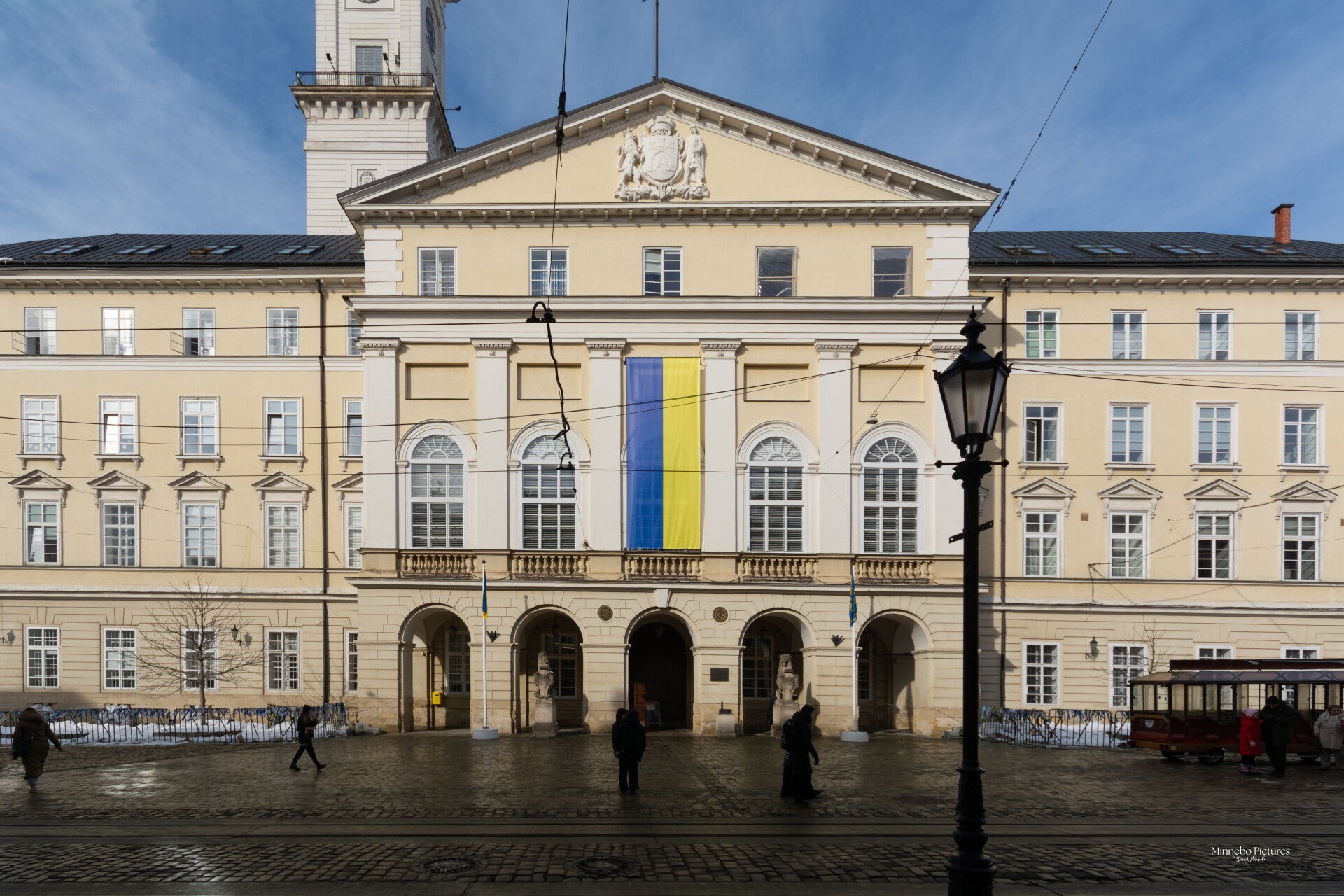 Voor het stadhuis van Lviv hangt een enorme Oekraïense vlag. In een stad waar het leven doorgaat ondanks de oorlog, staat dit beeld voor trots, vastberadenheid en samenhorigheid. Mensen lopen voorbij, trams rijden verder — maar de vlag blijft het middelpunt: een stil teken van kracht.