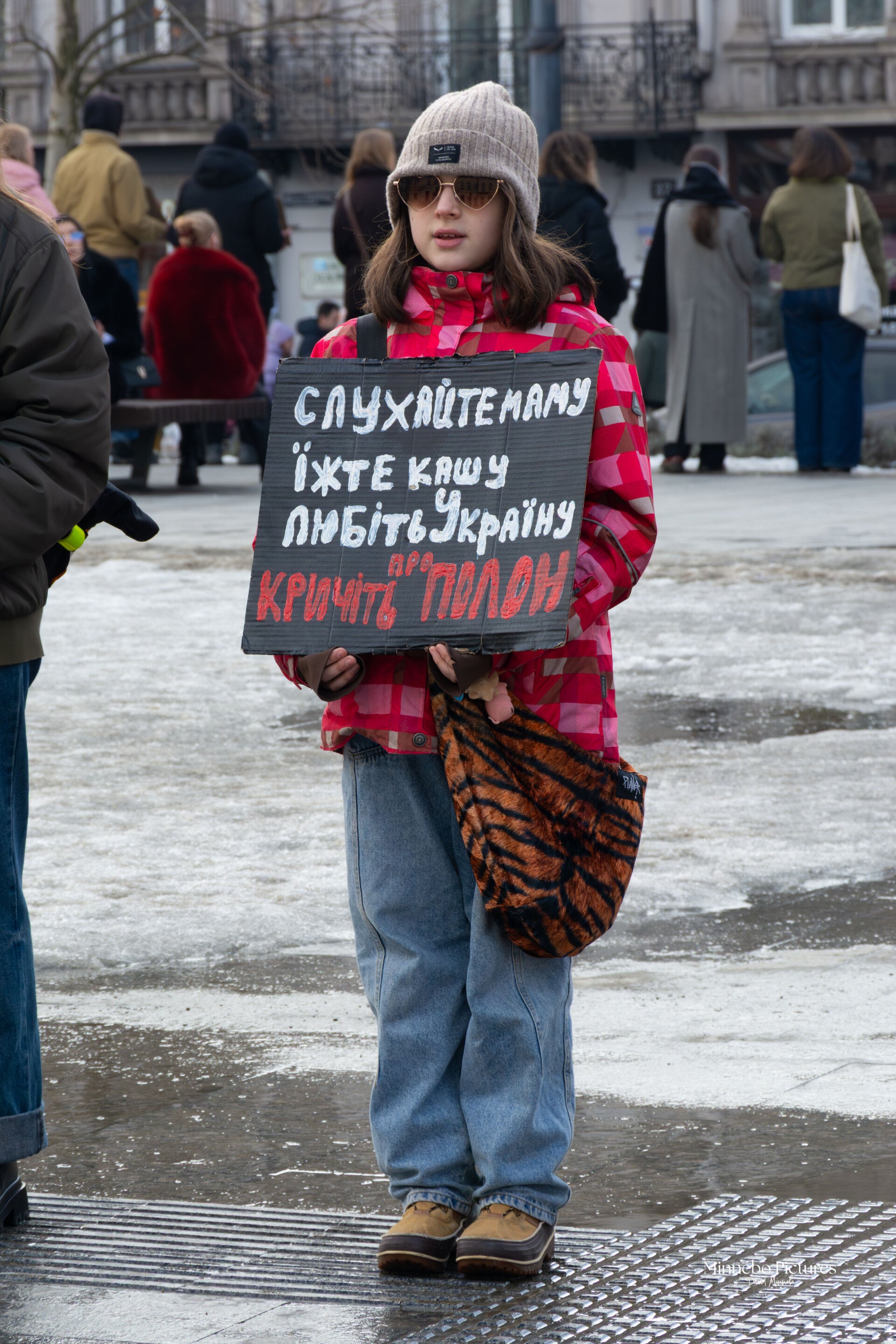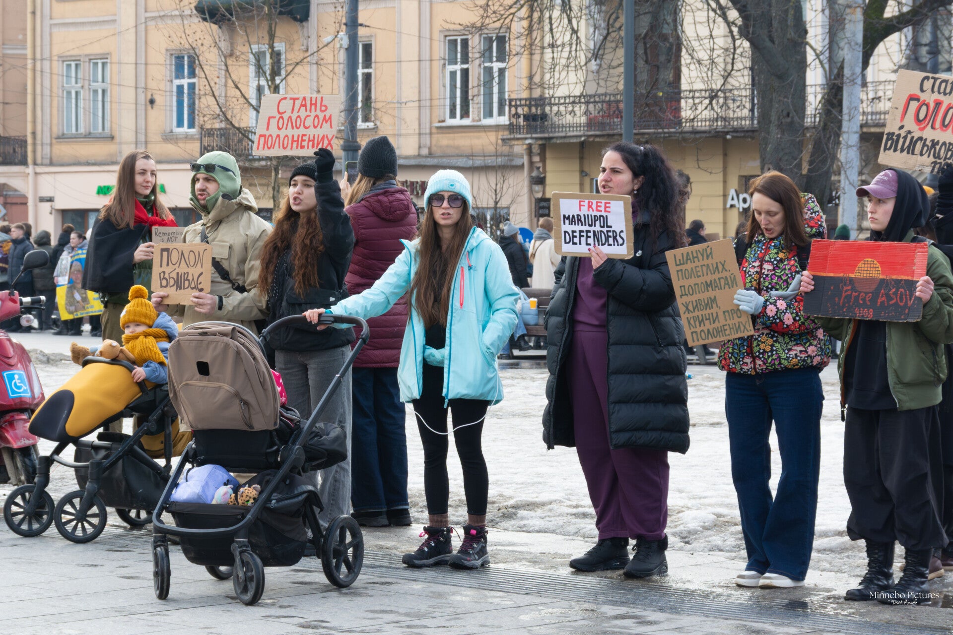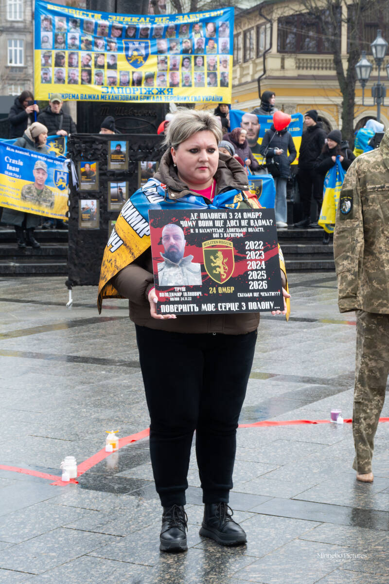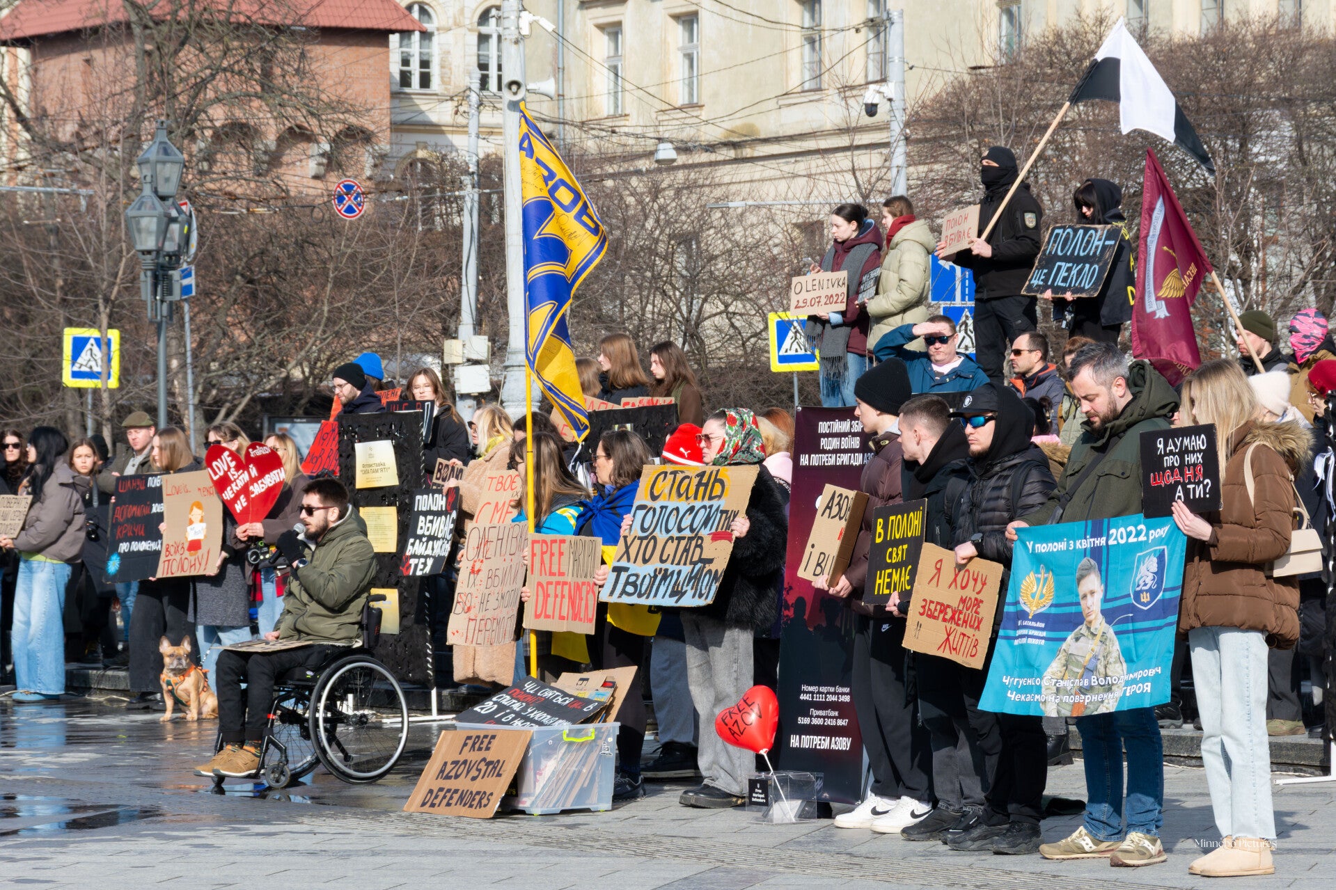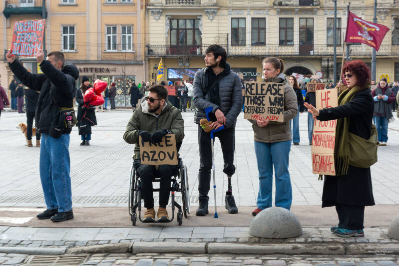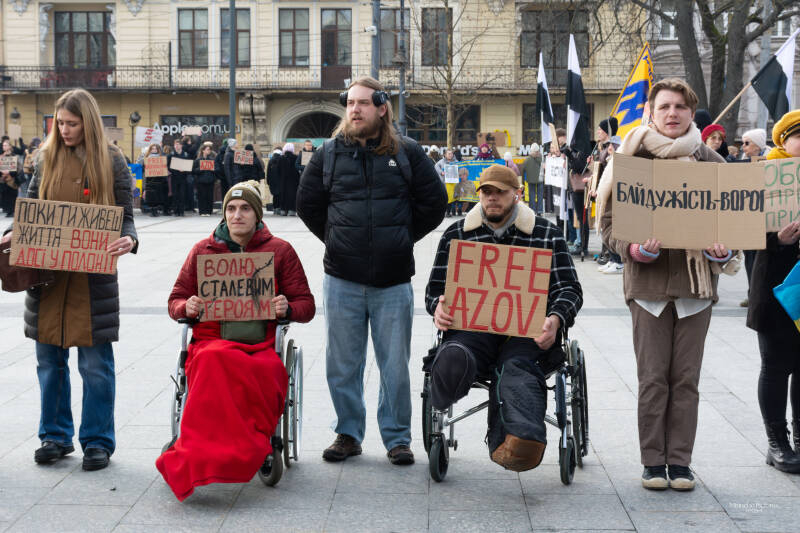 De demonstratie voor de vrijlating van de Azovstal‑soldaten raakt omdat ze tegelijk persoonlijk, zichtbaar en moreel geladen is. De mensen die hier staan – sommigen met een prothese, anderen in een rolstoel, allemaal met borden in hun handen – maken duidelijk dat dit geen abstract politiek thema is, maar een kwestie van menselijke waardigheid.