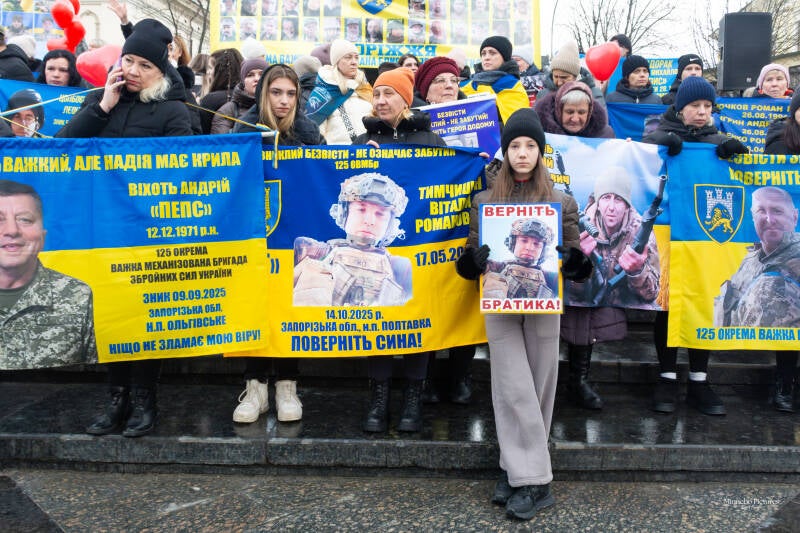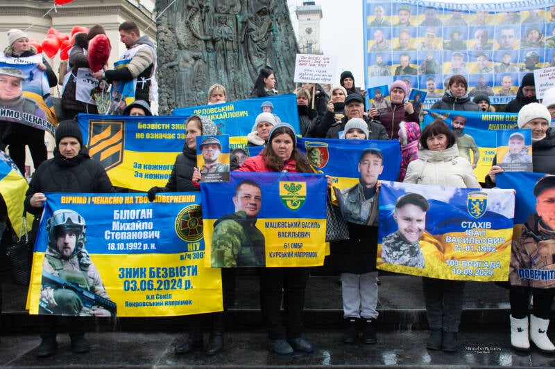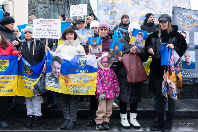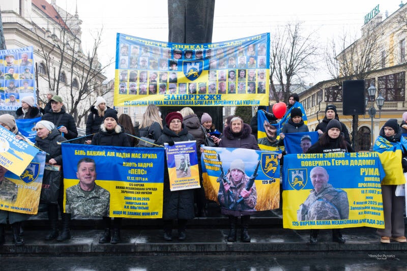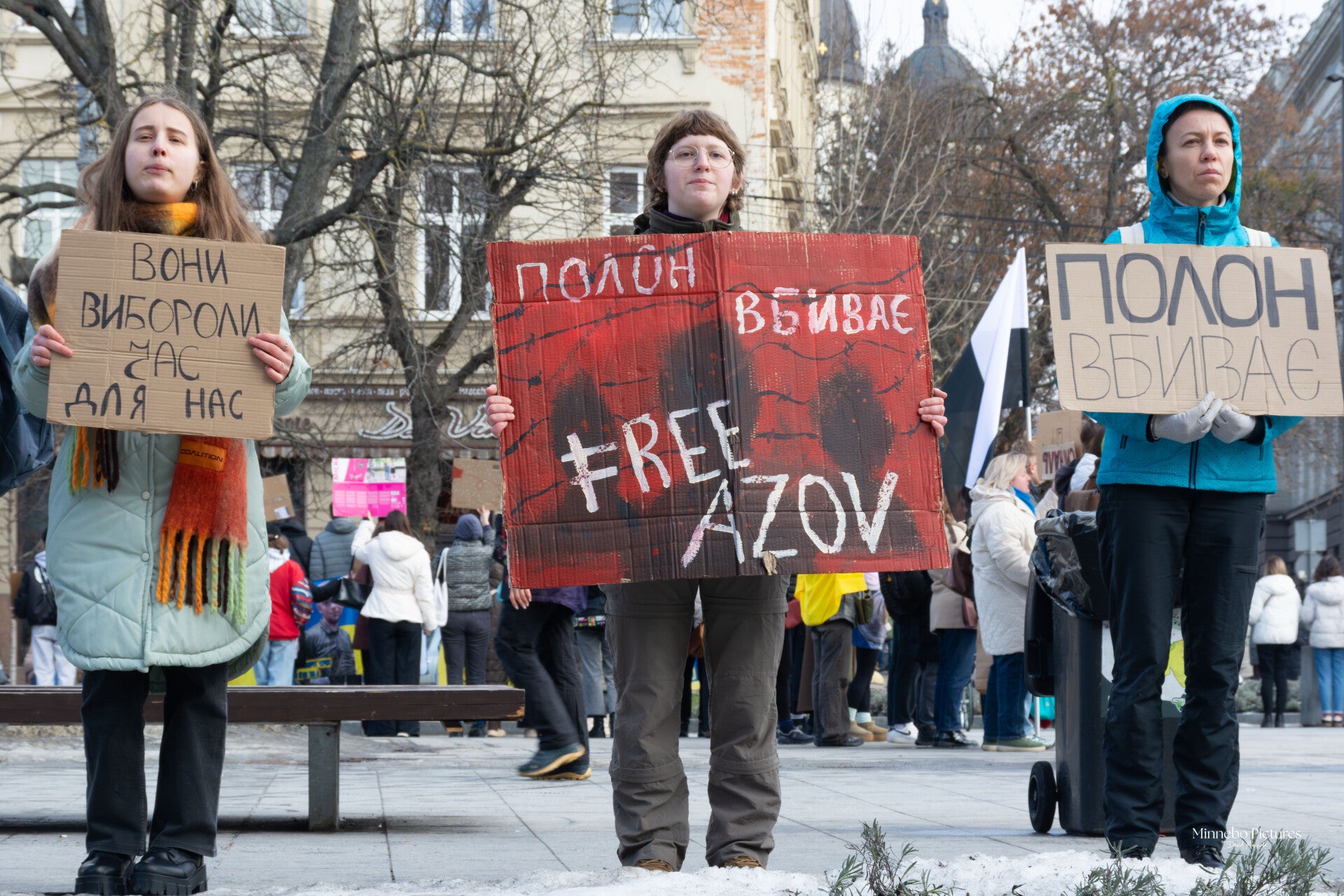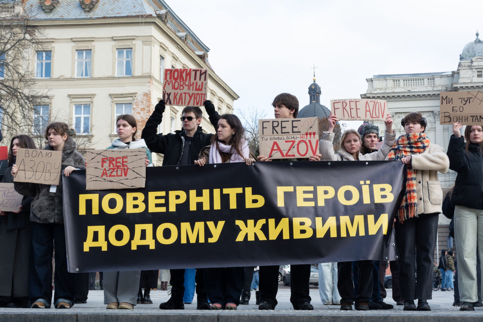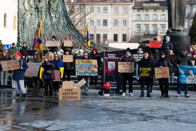 De borden vragen om de terugkeer van soldaten die maandenlang onder extreme omstandigheden Azovstal verdedigden. Het gaat om mensen die hun vrijheid verloren terwijl ze hun land beschermden.