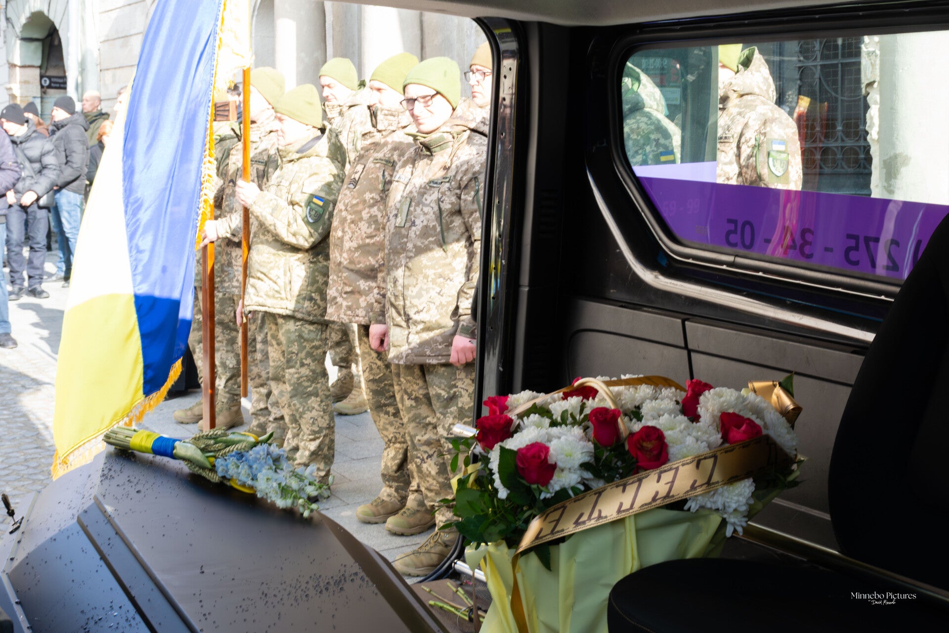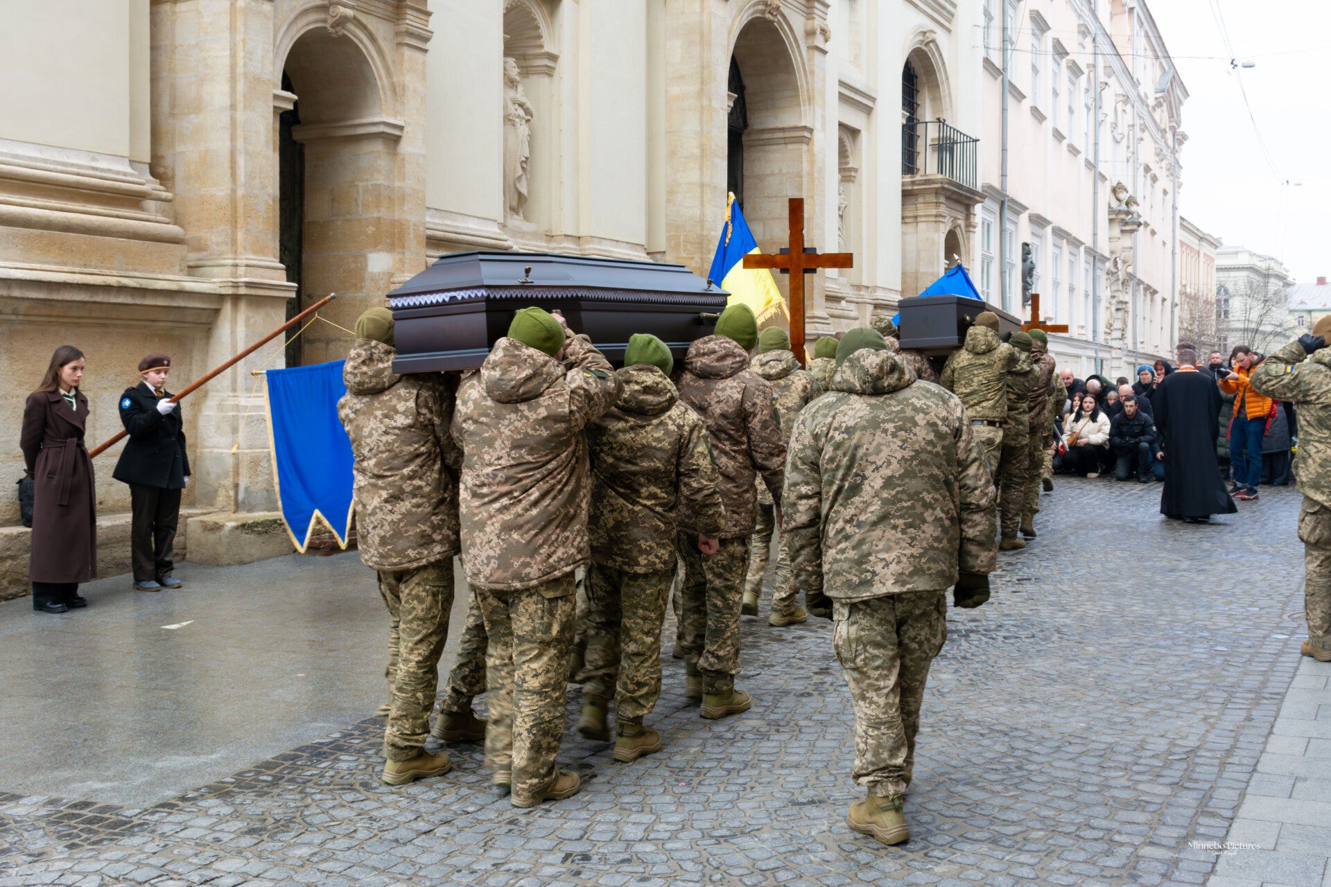 Een militaire begrafenis fotograferen voelt als het vastleggen van een moment dat tegelijk publiek én diep persoonlijk is. De plechtigheid is strak en ceremonieel, maar onder die vormelijkheid ligt een stille, rauwe emotie die je als buitenstaander bijna tastbaar voelt. Terwijl de soldaten de kisten dragen en de omstaanders knielen of hun hoofd buigen, wordt duidelijk dat dit niet zomaar een ritueel is, maar een afscheid dat een hele gemeenschap meedraagt.