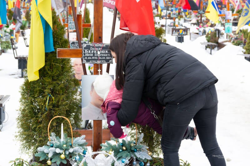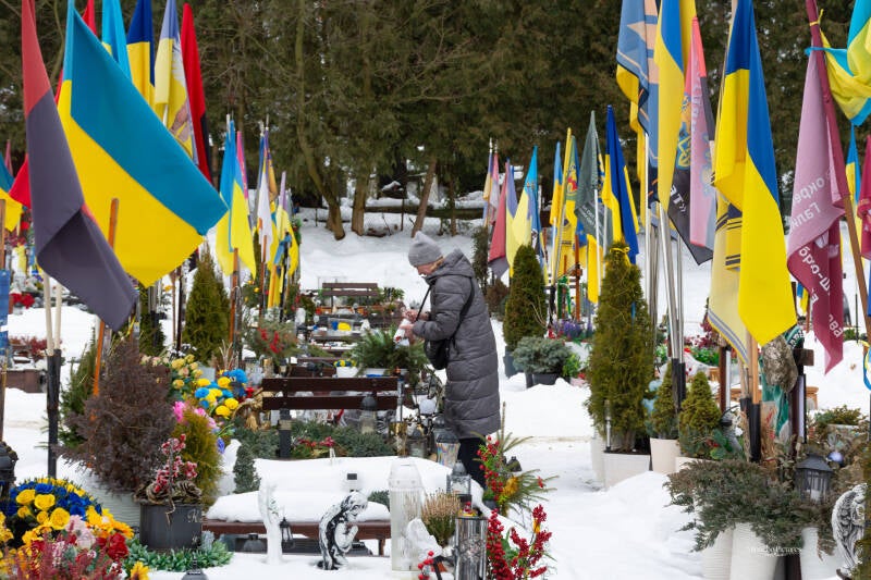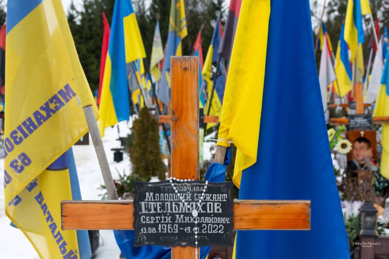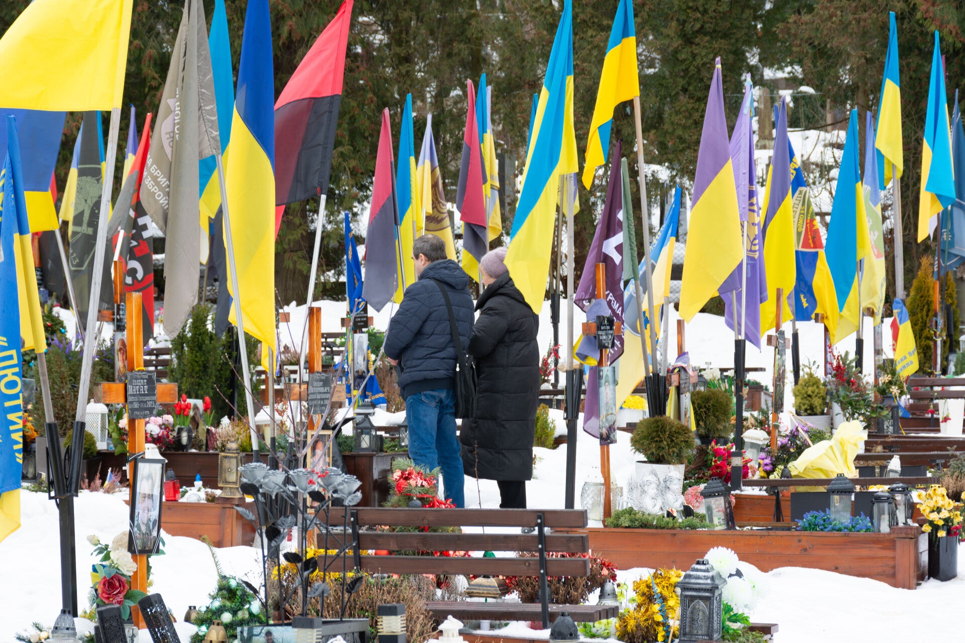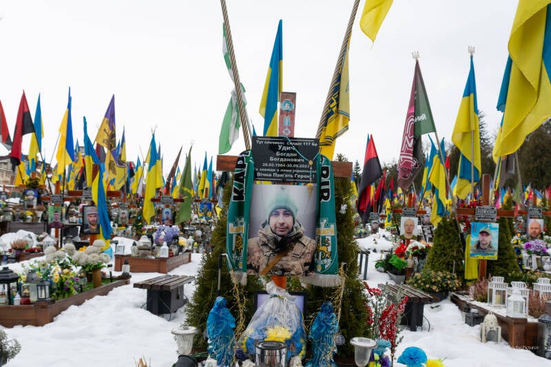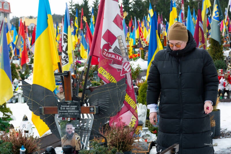 De Oekraïense vlaggen bewegen in de wind, en tussen de kruisen staan kleine persoonlijke herinneringen: een medaille, een briefje, een stuk uniform, een speelgoedauto van een kind.