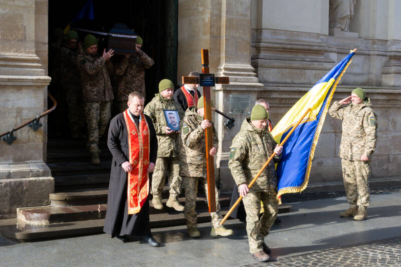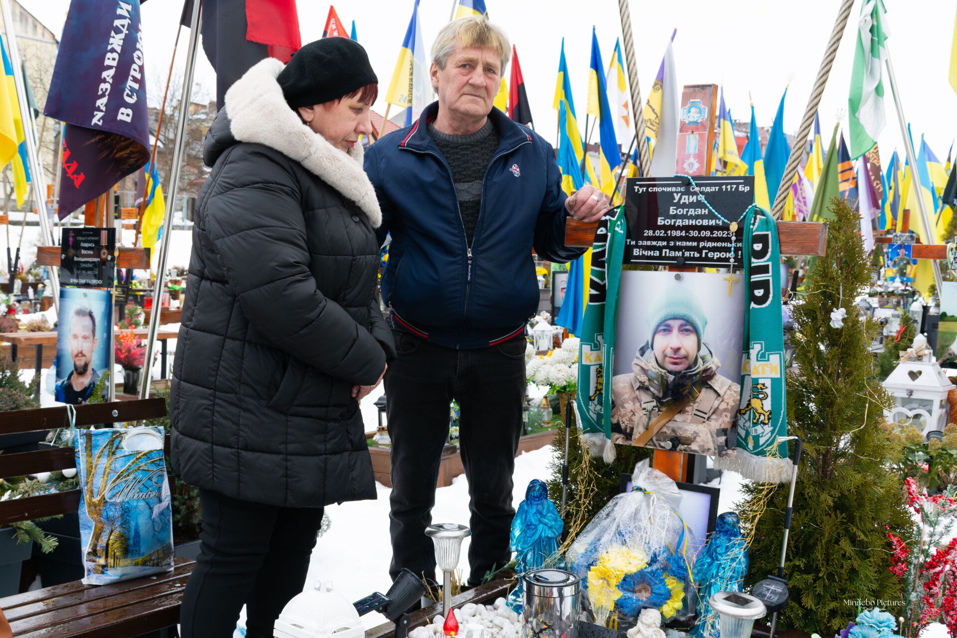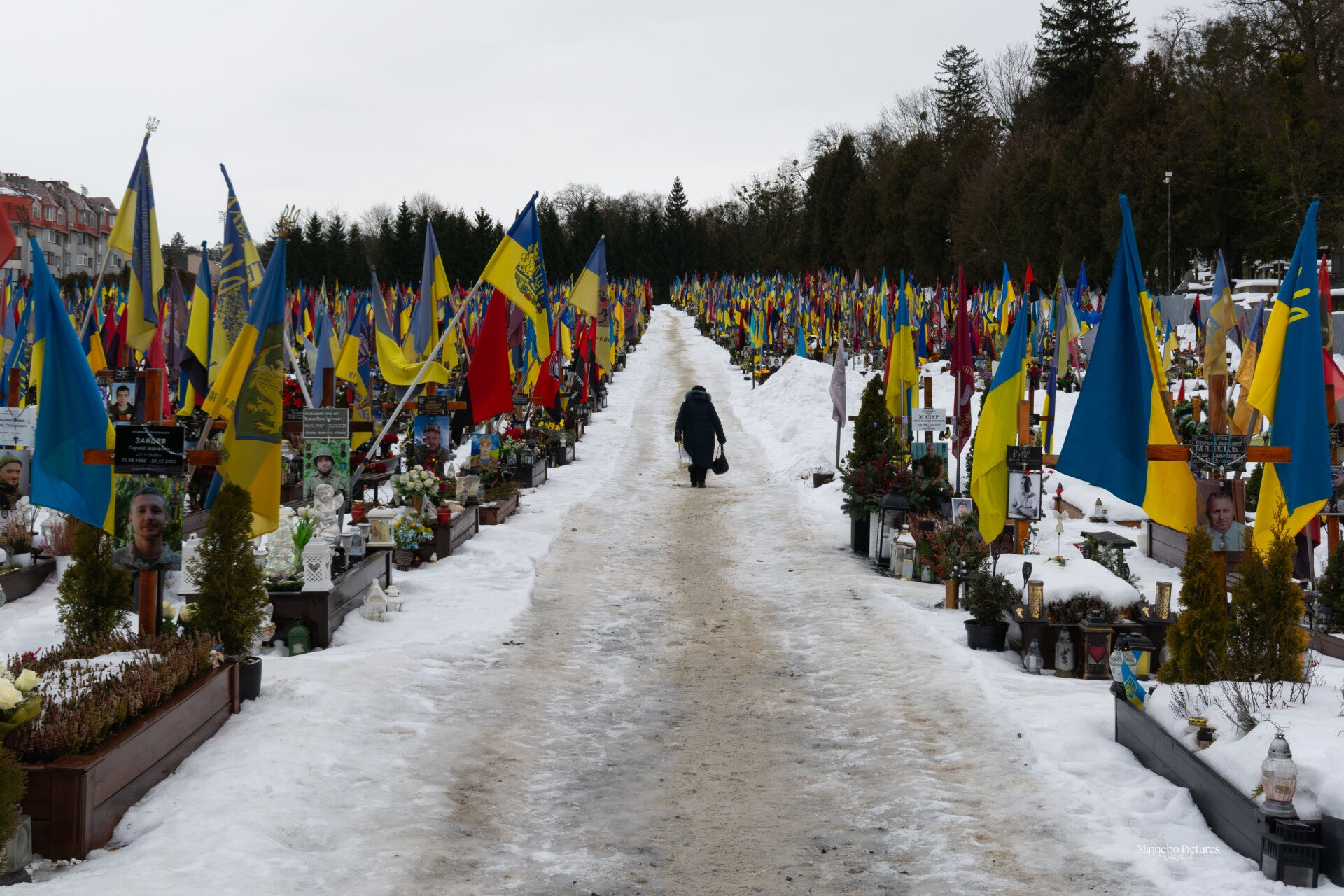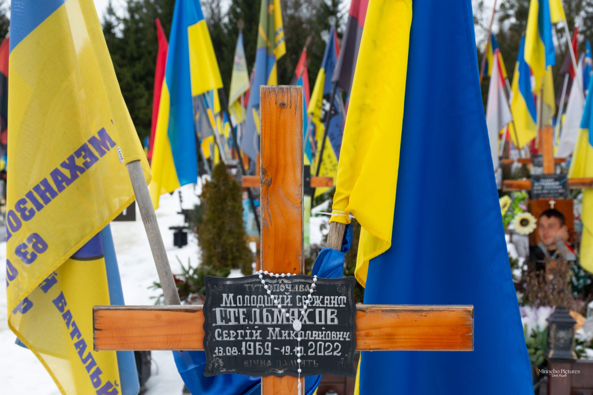 De Oekraïense vlaggen bewegen in de wind, en tussen de kruisen staan kleine persoonlijke herinneringen: een medaille, een briefje, een stuk uniform, een speelgoedauto van een kind.