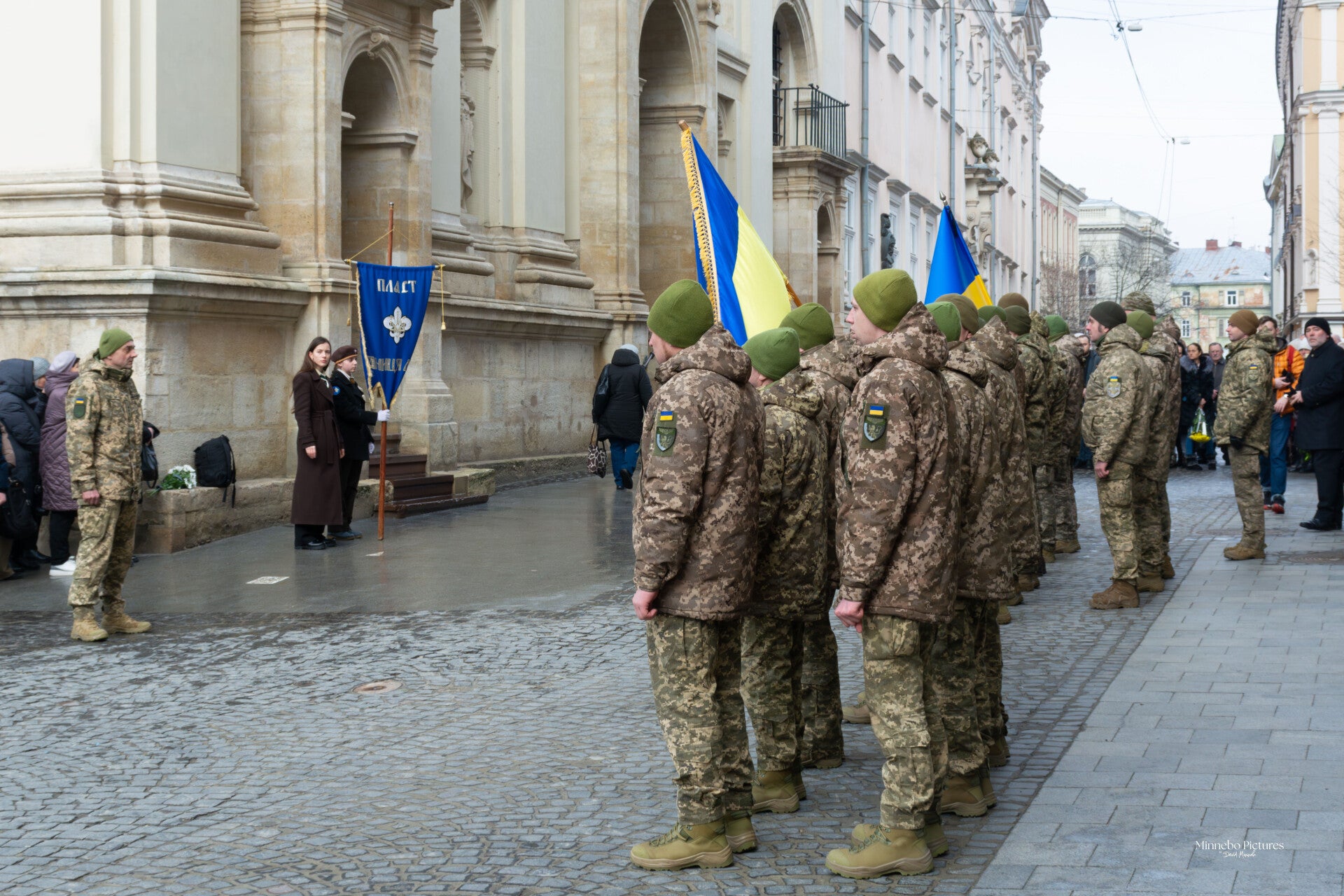 families en vrienden staan dicht bij elkaar, soms in stilte, soms met een hand die even wordt vastgehouden. omstanders, burgers, geestelijken en militairen delen hetzelfde moment, elk met hun eigen herinneringen en pijn.