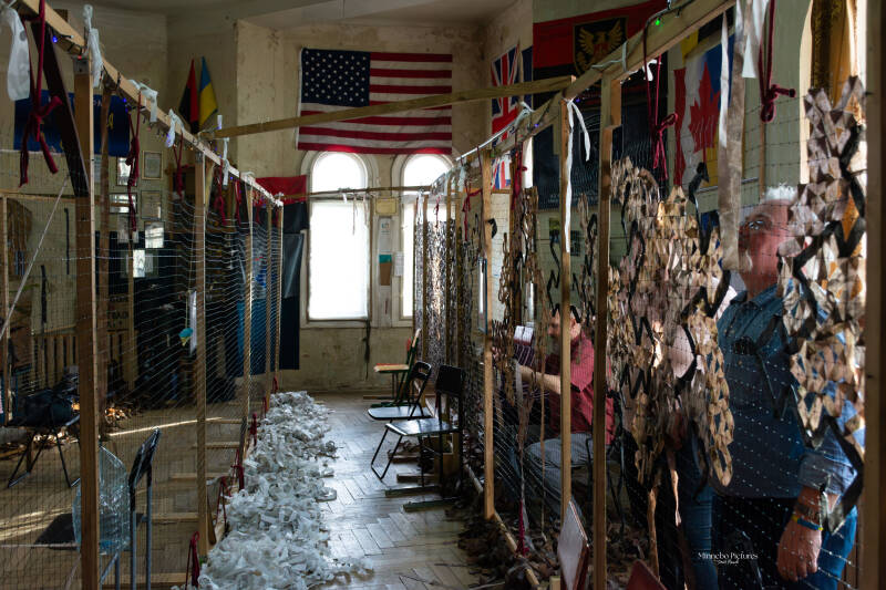 Het verbindt burgers met het front — mensen die niet kunnen vechten, dragen toch bij aan de veiligheid van soldaten. Ze werken vaak in scholen, buurthuizen of kleine ateliers, waar tafels en houten frames gevuld zijn met netten in wording.