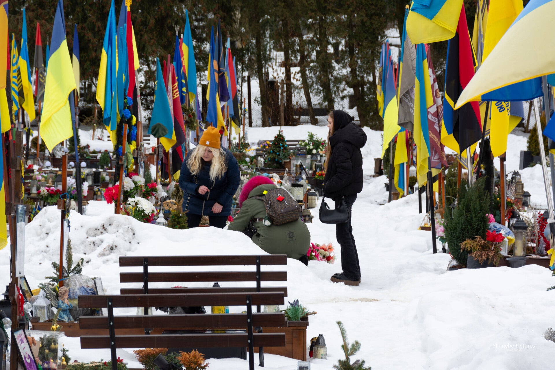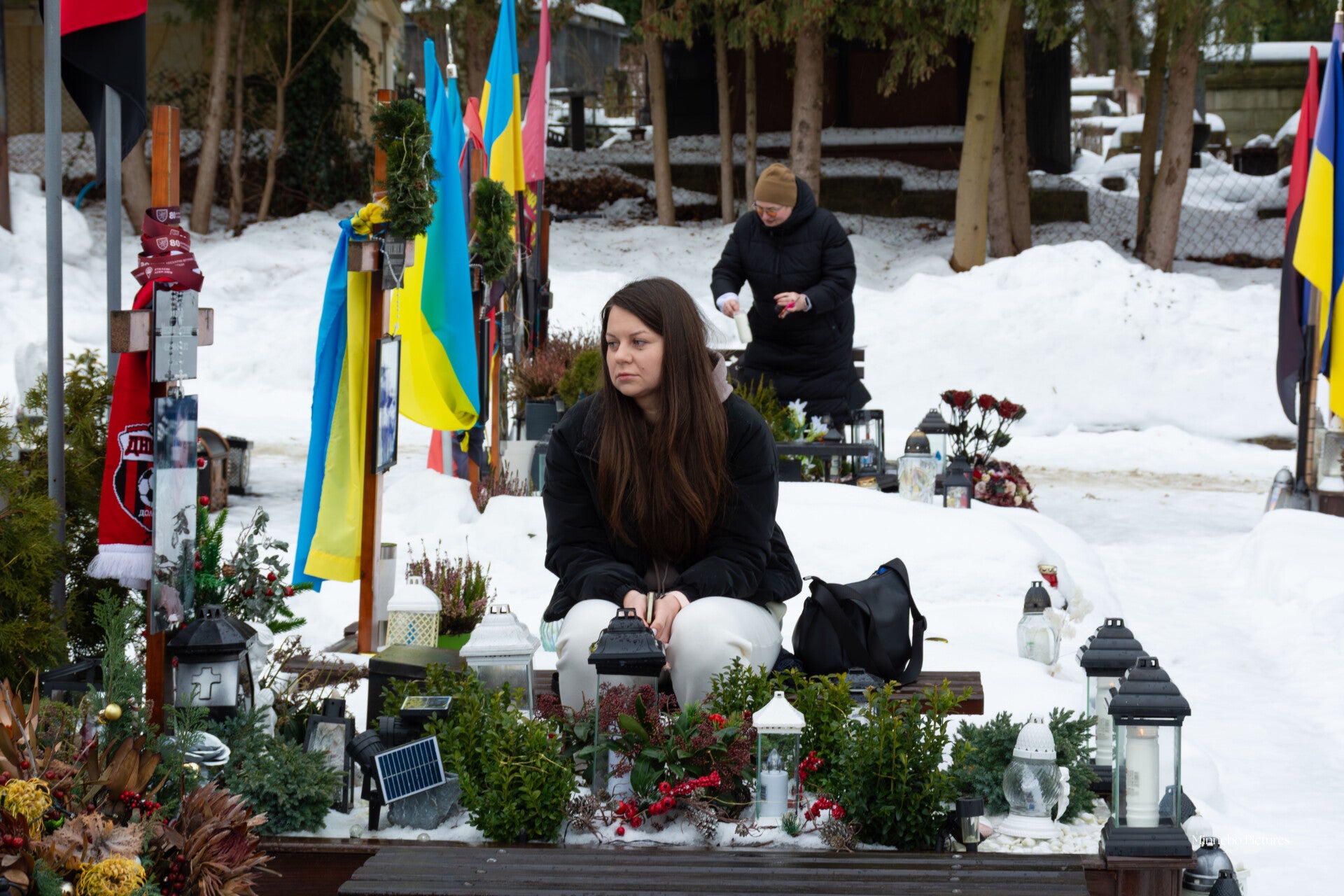 Ze zit bij zijn graf zonder gebaren of woorden. Haar aanwezigheid is stil, bijna ingetrokken, alsof ze gewoon dicht bij hem wil blijven. De sneeuw, de vlag en de bloemen vormen slechts de achtergrond; wat telt is dat ene moment van nabijheid dat blijft, ook nu hij er niet meer is.