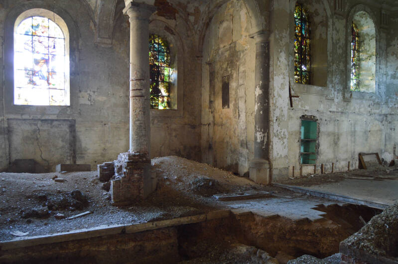 Een kerk waar alles gewoon achter gebleven is al jaren staat deze te verkommeren. het regent in, schimmel op de muren en er is een gat in het plafond.