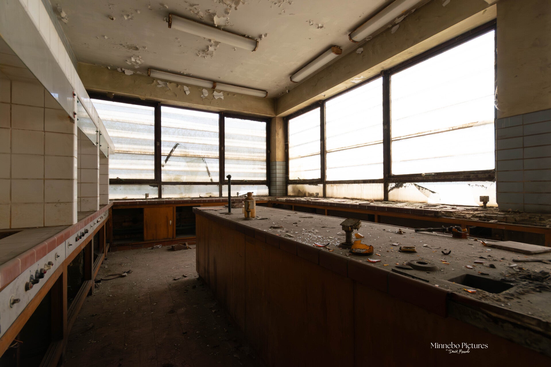 Wat ooit een goed draaiend labo was is nu verlaten de verf bladert van de plafond en de muren. Zie die typmachine nu is alles digitaal en staat ze daar stof te vangen er werd hier ook in de pauze gepoold moet hier zeker een gezellig boel geweest zijn met de collega's te samen in de pauze.